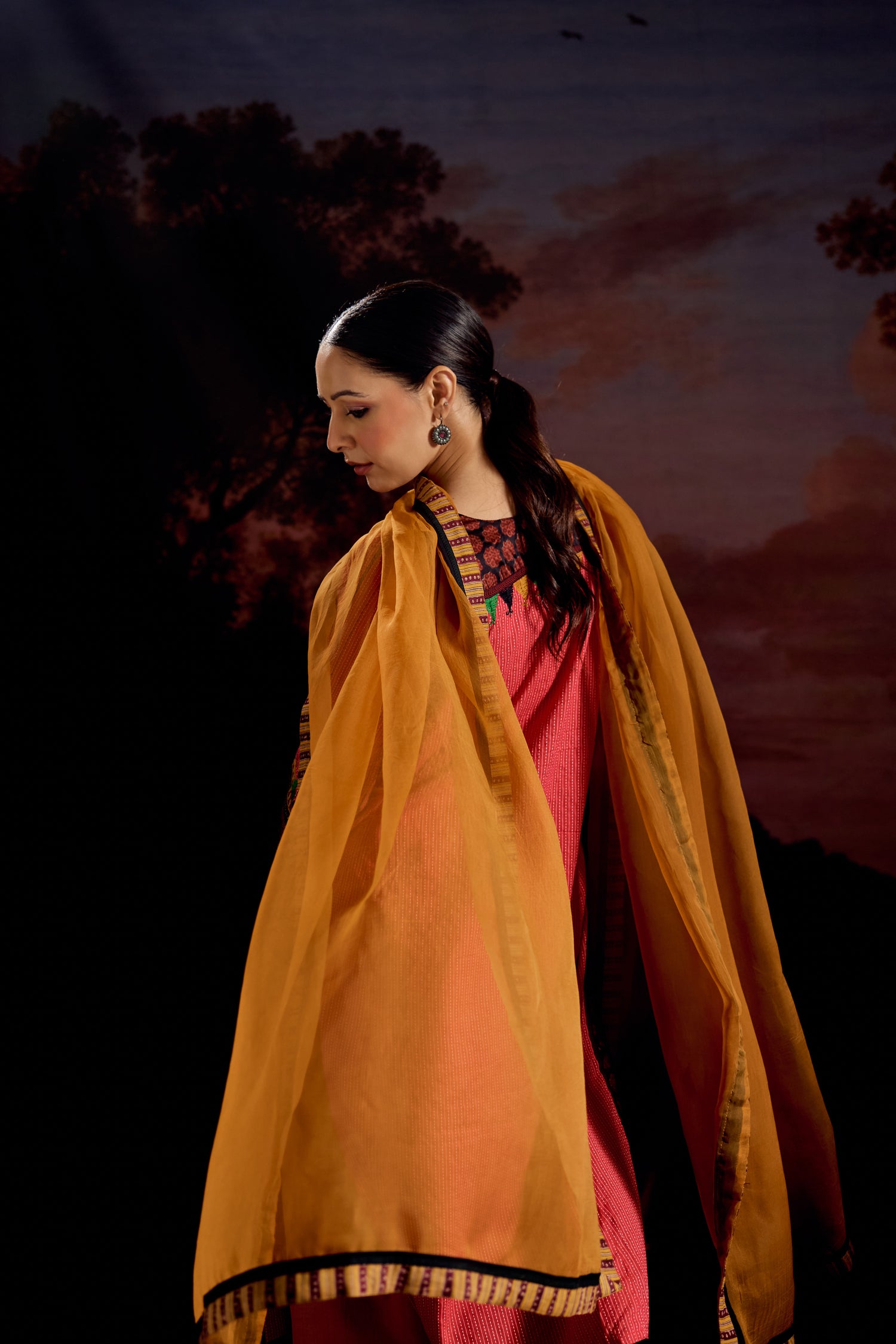 Rozana Cotton Embroidered Kurta Red (Set Of 3)