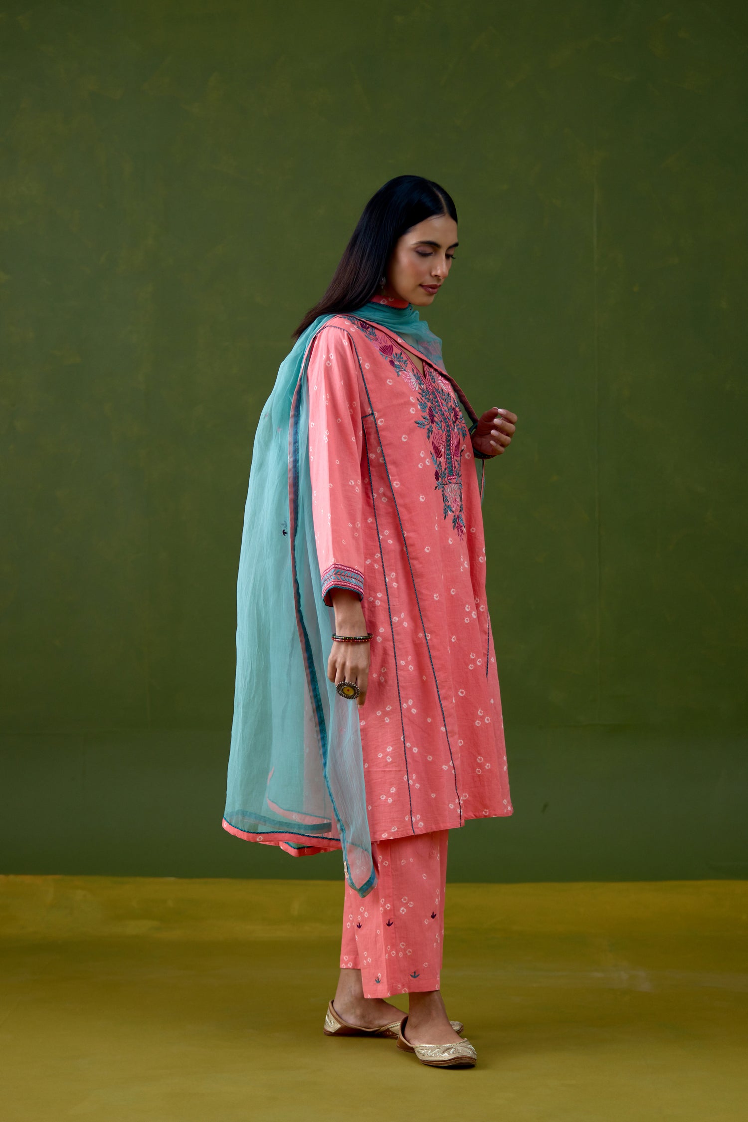 Tulsi Cotton Bandhej Embroidered Kurta Light Peach